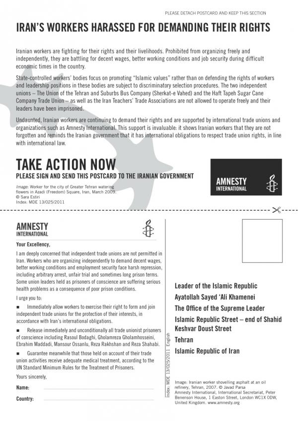 Amnesty International, in partnership with the global unions and the International Trade Union Confederation, is launching a campaign to support Iranian trade unions in their struggle for basic human and labour rights, ahead of the second anniversary of the 2009 Iran presidential elections.